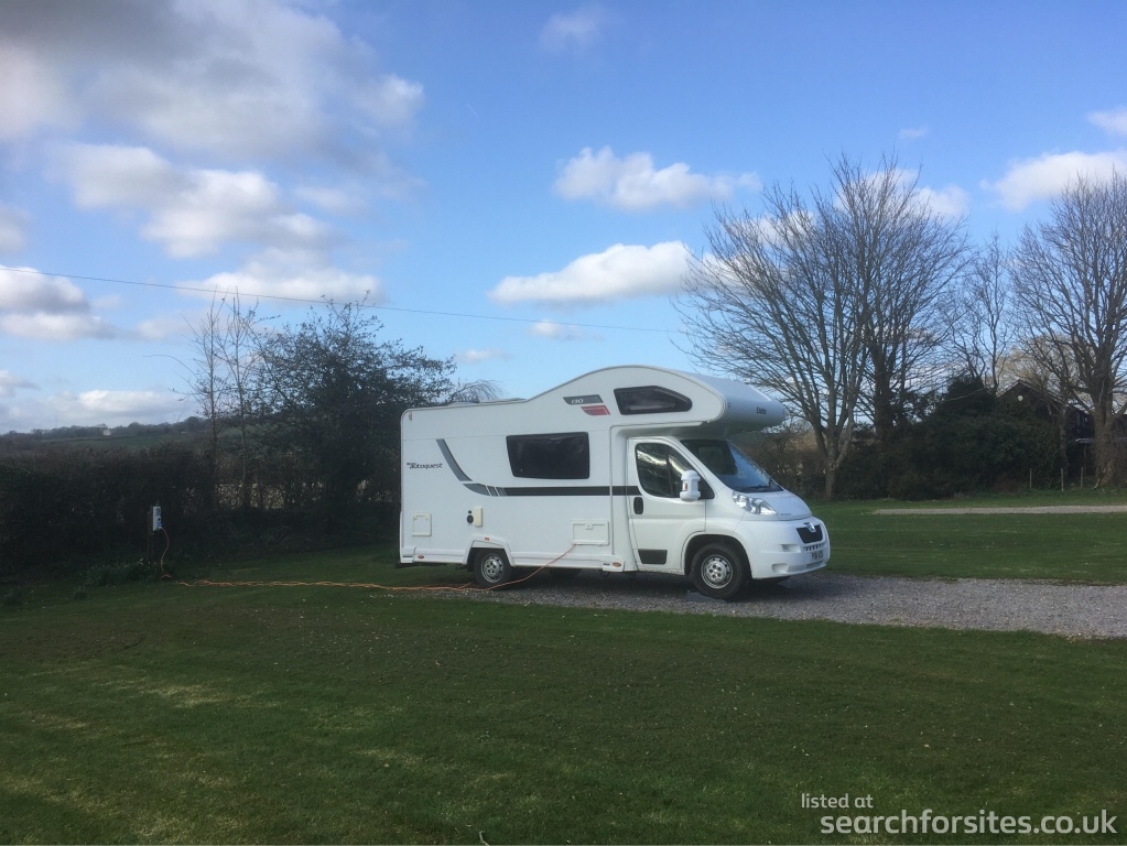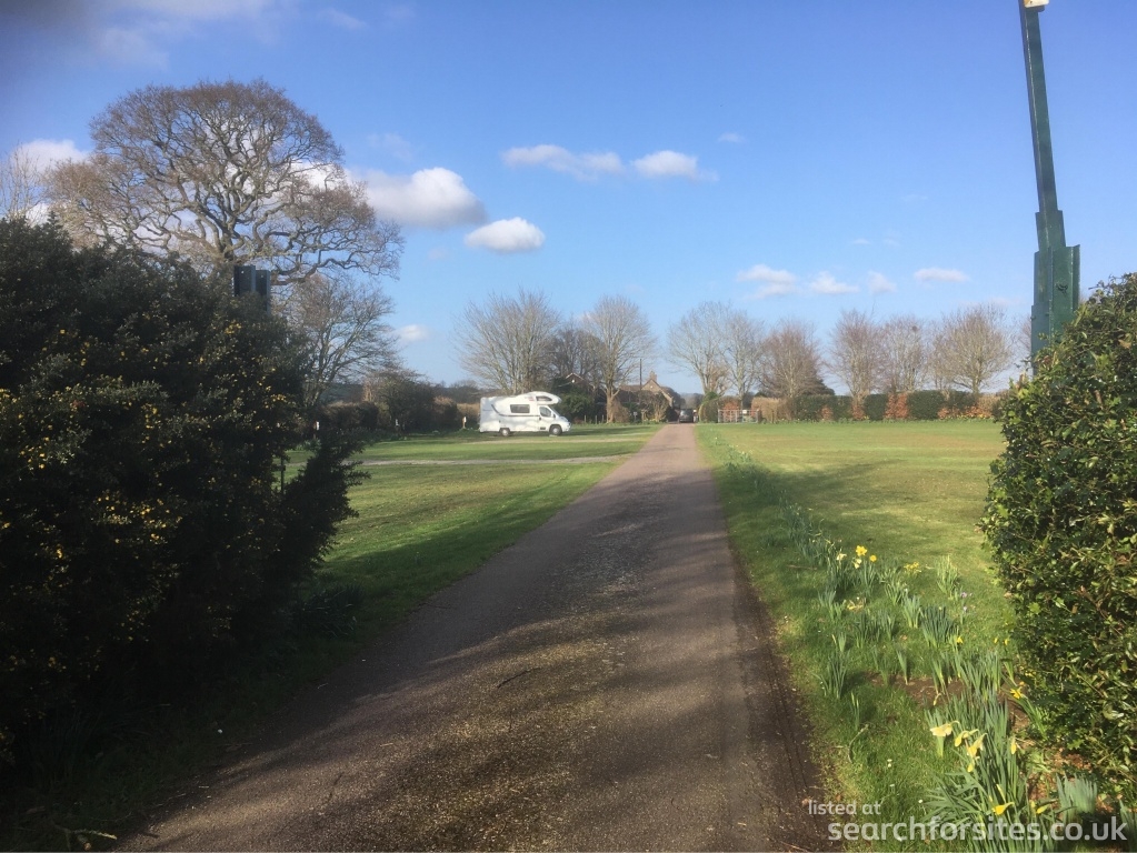 Large level grassed site with a tarmac drive running down the middle with four hard standing pitches and one grass to the left hand side.