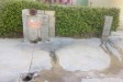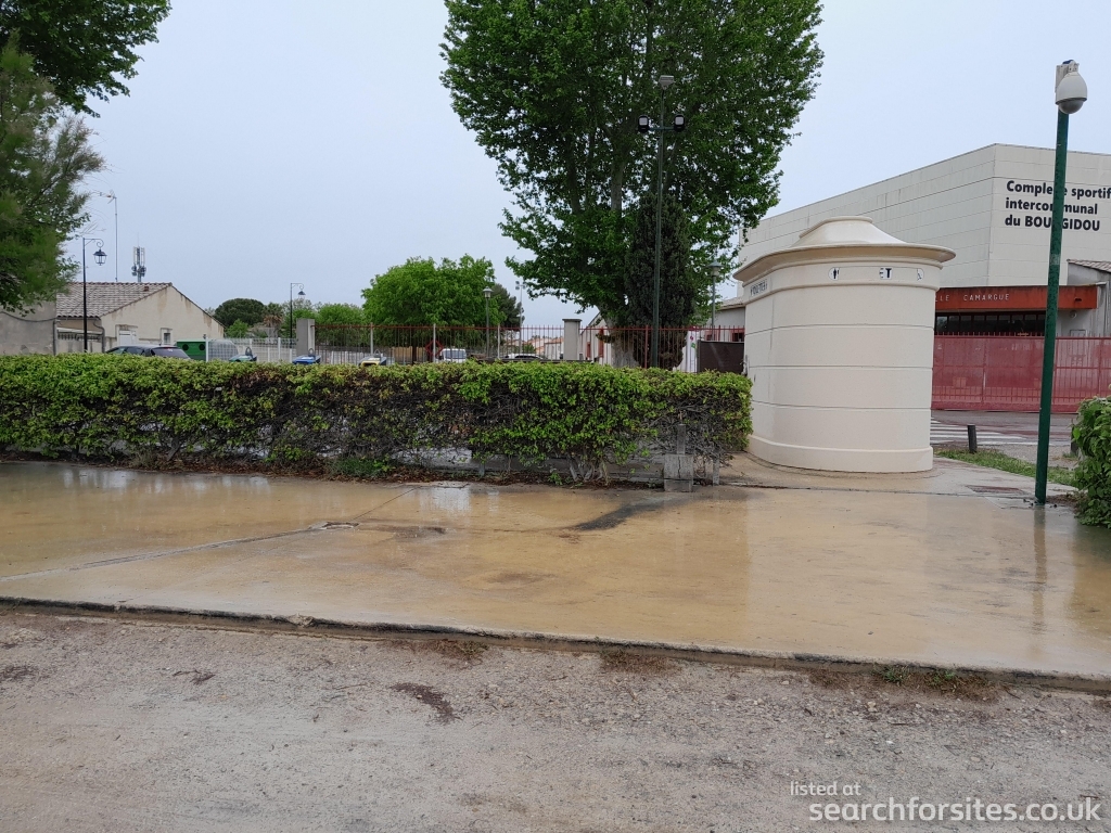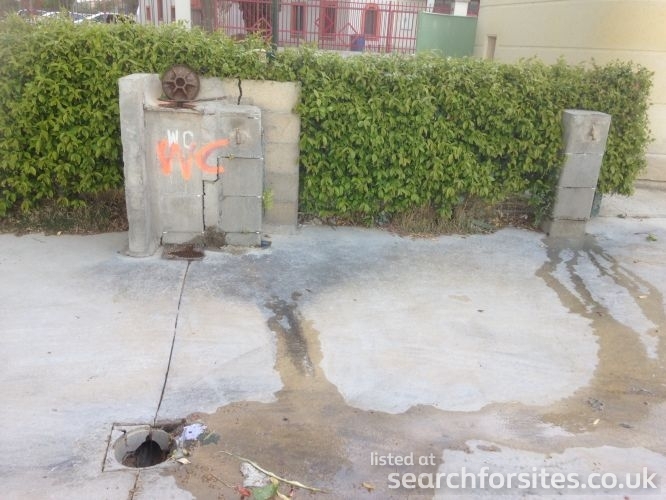Fresh water tap in hedge next to service point/grey waste drain out next to public toilet.