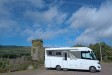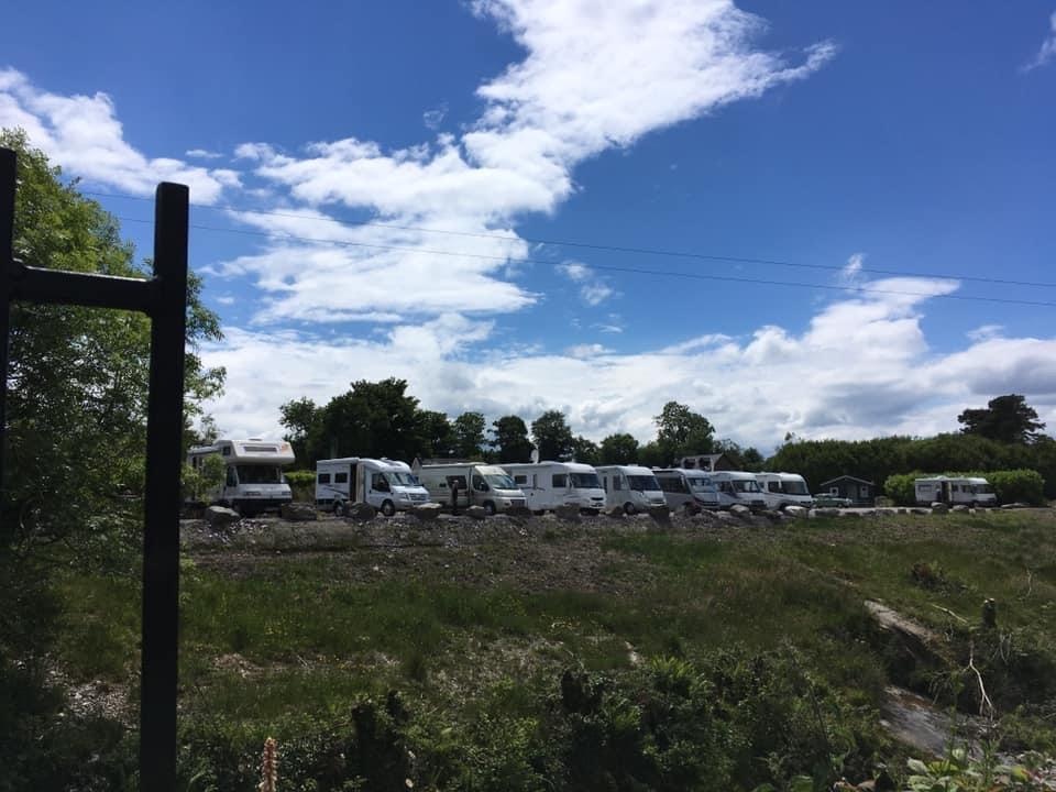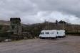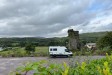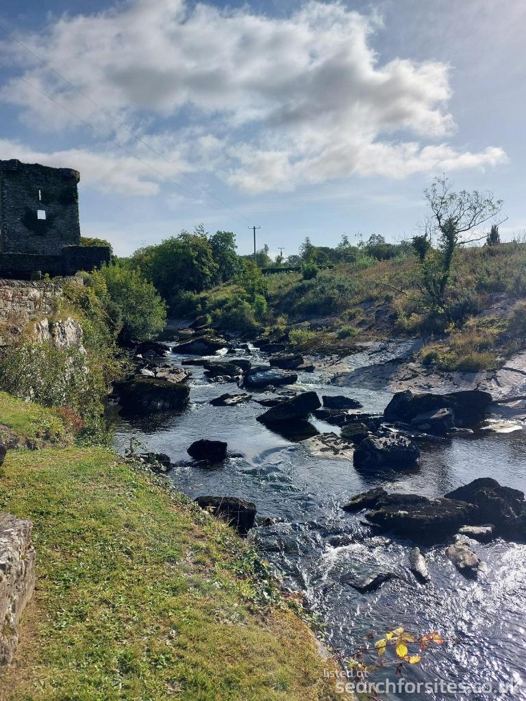 Level parking area looking across the Ouvane river to the ruins of Carriganass Castle and scenic hills beyond. €10 per night